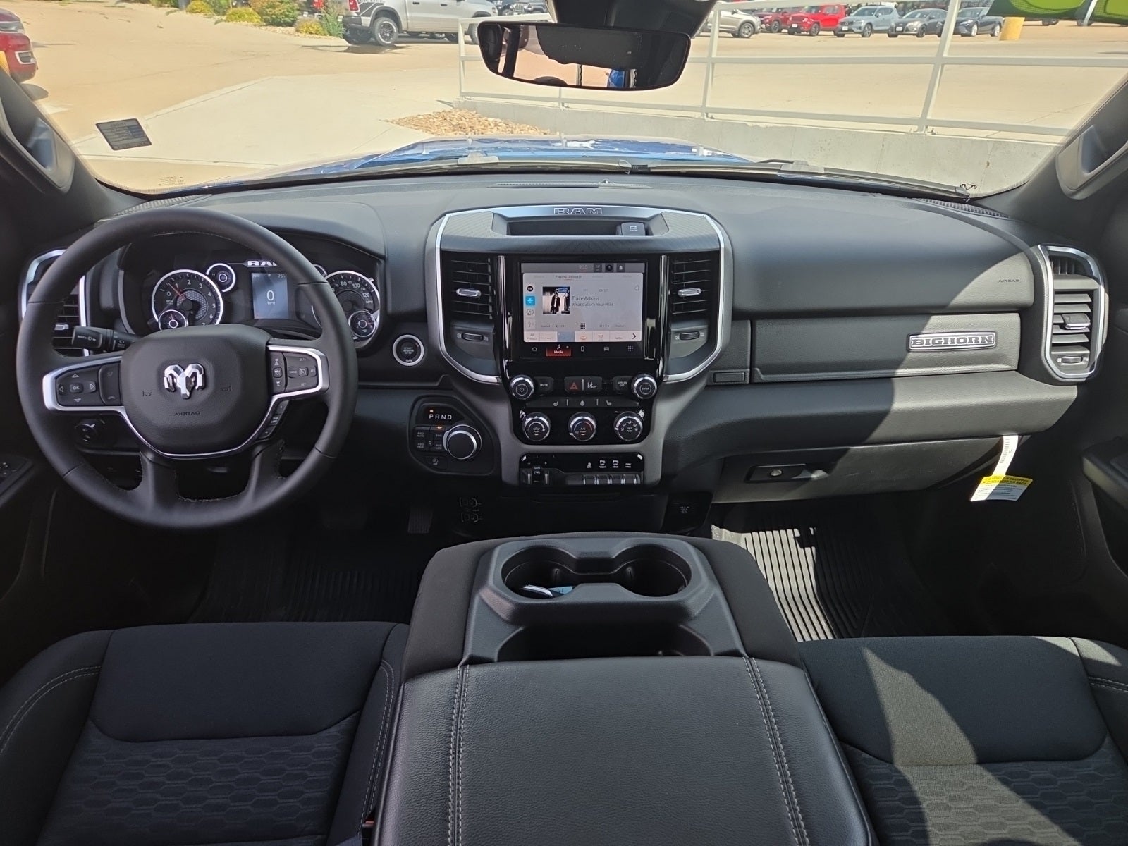 115V Auxiliary Power Outlet, 2nd Row In Floor Storage Bins, 3 Rear Seat Head Restraints, 3.21 Rear Axle Ratio, 3.55 Rear Axle Ratio, 4 Way Front Headrests, 4-Wheel Disc Brakes, 400W Inverter, 4G LTE Wi-Fi Hot Spot, 6 Speakers, ABS brakes, Air Conditioning, Alloy wheels, AM/FM radio, Anti-Spin Differential Rear Axle, Apple CarPlay/Android Auto, Auto High-beam Headlights, Auto Power-Folding Mirrors, Auto-Dimming Exterior Driver Mirror, Auto-Dimming Rear-View Mirror, Big Horn Badge, Big Horn Level 1 Equipment Group, Black Exterior Mirrors, Black Premium Power Mirrors, Brake assist, Bumpers: chrome, Cloth Bench Seat, Compass, Connectivity - US/Canada, Convex Wide-Angle Exterior Mirror Insert, Delay-off headlights, Driver door bin, Dual front impact airbags, Dual front side impact airbags, Electronic Stability Control, Exterior Mirrors Courtesy Lamps, Exterior Mirrors w/Heating Element, Exterior Mirrors w/Supplemental Signals, Front anti-roll bar, Front Center Armrest w/Storage, Front fog lights, Front License Plate Bracket, Front reading lights, Front Seat Back Map Pockets, Front wheel independent suspension, Fully automatic headlights, Glove Box Lamp, GPS Antenna Input, Heated door mirrors, Heated Front Seats, Heated Steering Wheel, Illuminated entry, Integrated Voice Command w/Bluetooth®, Leather Wrapped Steering Wheel, Low tire pressure warning, Manual Adjust 4-Way Front Passenger Seat, Manual Folding Exterior Mirrors, Manufacturer's Statement of Origin, MOPAR Front & Rear Rubber Floor Mats, Occupant sensing airbag, Outside temperature display, Overhead airbag, Overhead console, Panic alarm, ParkView Rear Back-Up Camera, Passenger door bin, Passenger vanity mirror, Power 2-Way Driver Lumbar Adjust, Power Adjust 8-Way Driver Seat, Power Adjustable Pedals, Power door mirrors, Power steering, Power windows, Quick Order Package 23Z Big Horn, Radio data system, Radio: Uconnect 5 W w/8.4 Display, RAM Grille Badge - Chrome, Rear 60/40 Folding Seat, Rear anti-roll bar, Rear Power Sliding Window, Rear seat center armrest, Rear step bumper, Rear Window Defroster, Remote keyless entry, Speed control, Split folding rear seat, Steering Wheel Mounted Audio Controls, Sun Visors w/Illuminated Vanity Mirrors, Supplier Part Tracking (J-1), Tachometer, Telescoping steering wheel, Tilt steering wheel, Traction control, Trailer Brake Control, Trip computer, Universal Garage Door Opener, USB Host Flip, Variably intermittent wipers, Voltmeter, Wheels: 18 x 8 Cast-Aluminum Painted.